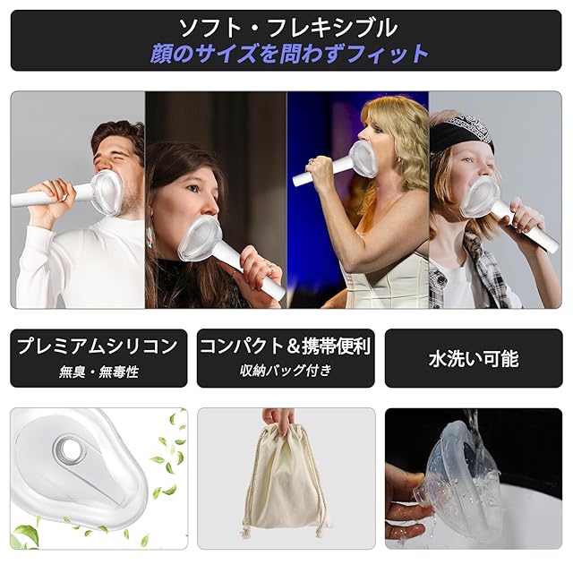 【快適な使用感&鼻出し設計】このボイトレ 防音グッズは人間工学に基づいて作られています。顔の大きさに関係なく、口の動きのための大きなスペースを確保しながらしっかりと口を覆うことができます。鼻は マスク外に出るため、呼吸がしやすく安心です。マイクのようなデザインは、持ちやすいだけでなく、没入感をもたらしてくれます。さらに軽量で持ち運びも便利(キャンバスバッグ付き)