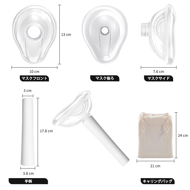 【仕様】サイズーマスク:約13cm(長さ) x 10cm(幅) x 8cm(高さ)、 サプレッサチューブ:長さ:約18cm、直径ー約4cm、 重量ー168g、 素材- 食品級シリコンマスク&ABS樹脂ハンドホールド、キャンバス収納バッグ付き