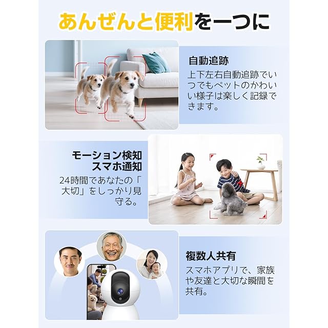 見守りカメラ【2025改良型】ペットカメラ iphone対応 1080PフルHD みまもりカメラ 300万画素 防犯カメラ スマートカメラ 双方向会話 常時録画 動体検知 スマホ対応 ペット 犬/猫/赤ちゃん/高齢者 見守り カメラ 警報通知 家族共有 小型 ベビーカメラ 室内 家庭用 接続簡単 監視カメラ
