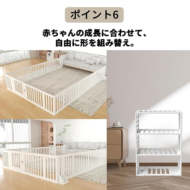 【多機能性】ベビーサークルは形を自由に変えられるため、ベビーサークルとしてだけでなく収納棚としても活用できます。工具が不要で、簡単に組み立てや取り外しが可能です。また、このベビーサークルは組み立てと接続式のため、使用しないときは取り外して、コンパクトに収納できます。お子様が成長してベビーサークルが不要になった際には、収納棚として専用の収納スペースとしても利用できます。