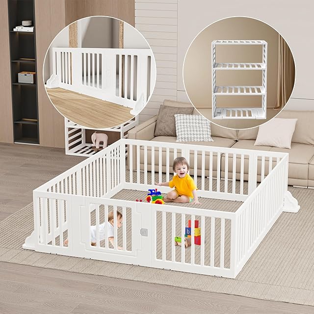 【事故を防ぐ設計 】お子様をベビーサークルに入れると、大人とお子様の両方がお互いをはっきりと見ることができます。ベビーサークルの幅は5cmで、お子様から大人がはっきり見え、ベビーサークルの高さは58cmなので、お子様がベビーサークルをまたいでしまう心配もありません。ベビーサークルの各板の接続部分と四角をしっかり固定しているので、ベビーサークルが简単には揺れません。ベビーサークルからお子様の遊びを見守ることができます。