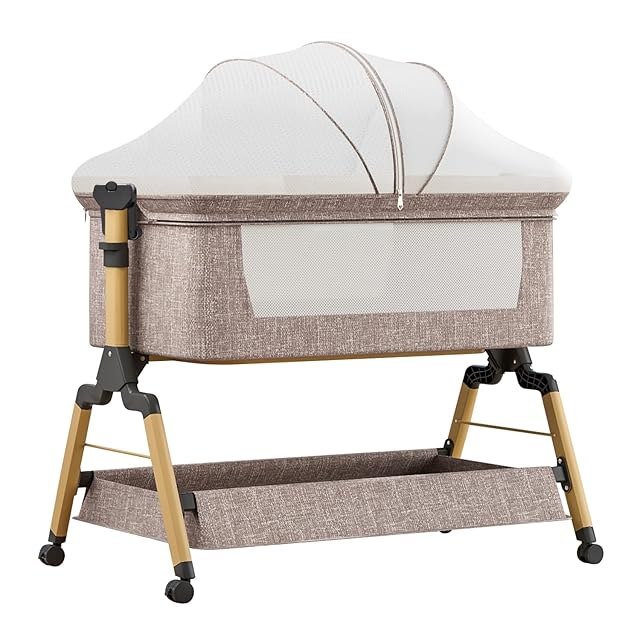 【折畳・移動便利】ベビーベッドのカバーは肌に優しい。通気性優れるリネン、赤ちゃんの肌を守ります,気持ちよくて肌に優しい,横からでも赤ちゃんの様子を確認することができるのでパパママも安心な安全仕様。布カバーはパールコットンで囲まれ、赤ちゃんを保護します。360°回転できる静音キャスター付き、寝室への移動も楽々、ママも簡単に持ち運びが可能です。キャスターにはブレーキが付いているので、ベビーベッドをいつでも固定できます。