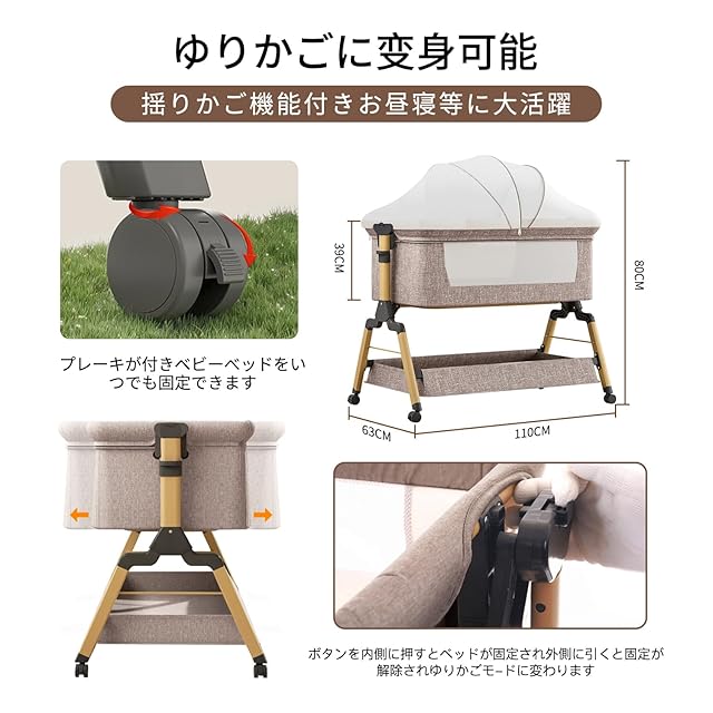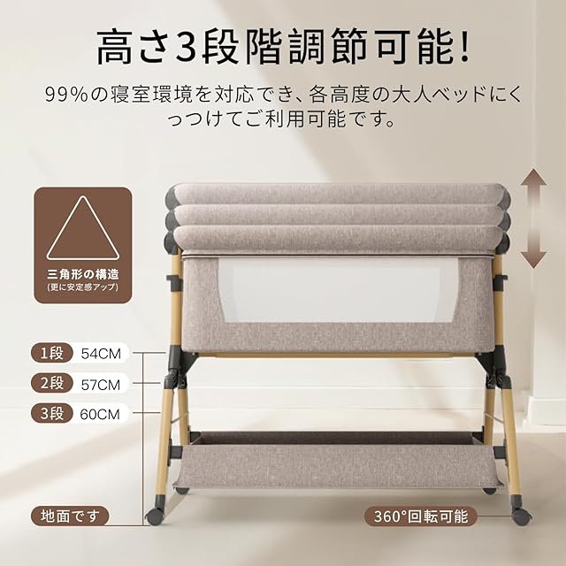 【高さ調節可能・ゆりかごに変身可能】高さ6段階調節可能で、各高度の大人ベッドにくっつけてご利用可能です。ーベッドは斜めの調節可能で、新生児に対してミルクの吐くことを防ぐことができます。三角形の構造+ 4点ポジショニングサポートはピラミッドと同じくらい安定しています。固定ベルト付き、大人ベッドから離れを防ぐ、くっつける可能、更に安定、安心。揺りかご機能付き、10度のわずかな揺れで赤ちゃんはすぐに眠りにおちます。