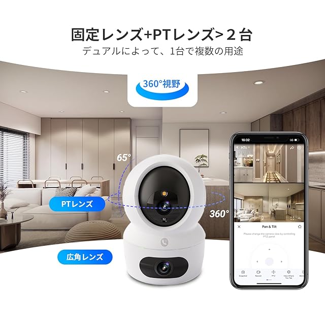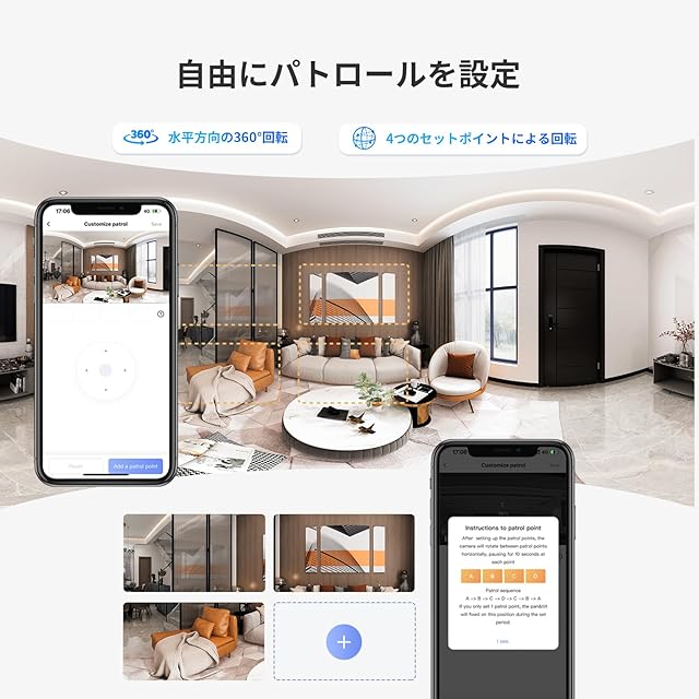 360°死角ゼロ監視 ⚡水平340°/垂直90°パン・チルト ⚡不審者侵入時は自動巡回モード発動