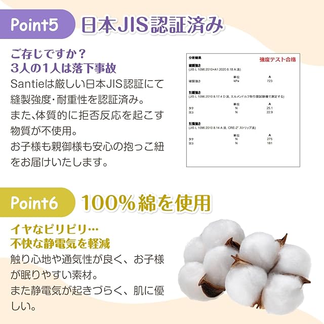 ✅【日本JIS認証済み】日本では歩行中・屈んだとき・抱っこ紐に乗せるときなどのタイミングで3人に1人は落下事故を経験しています。そこでSantieでは、縫製強度や耐重性において厳しい日本JIS認証を取得致しました。お子様はもちろん、使用する親御さんのことを第一に考えて作られました。