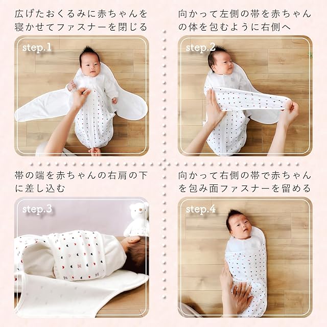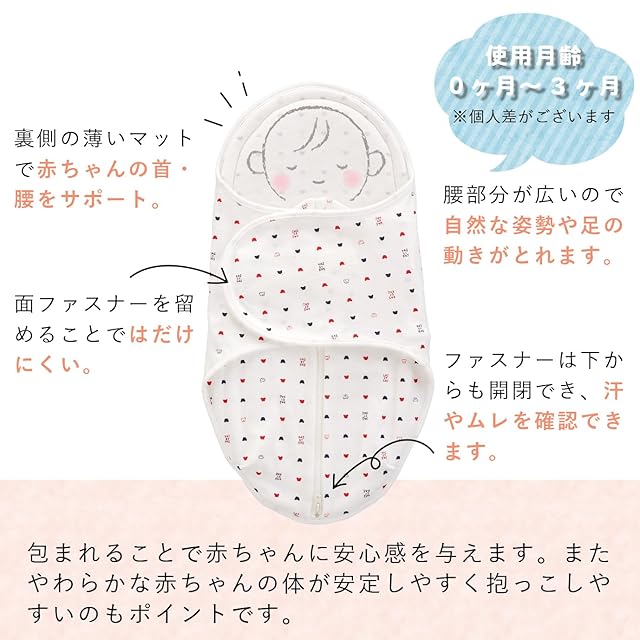 モロー反射や夜泣きなど寝かしつけの「困り」に応えるスワドルおくるみ。股関節に負担をかけないこだわりのサイズ感で自然な動きがとれます。また、足元から開くファスナーで体温調整もできるので安心です。