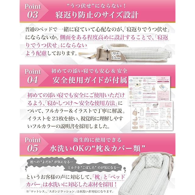 【フルカラー説明書が付属!】 本製品には手軽に赤ちゃんと添い寝できるよう、商品の収納方法 はもちろん 衛生的に使える洗濯方法 など丁寧に使用方法を解説させて頂きました。女性のお客様1人でも使い始められるよう、イラスト23枚で徹底解説しています。