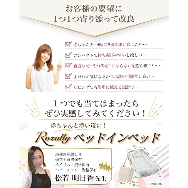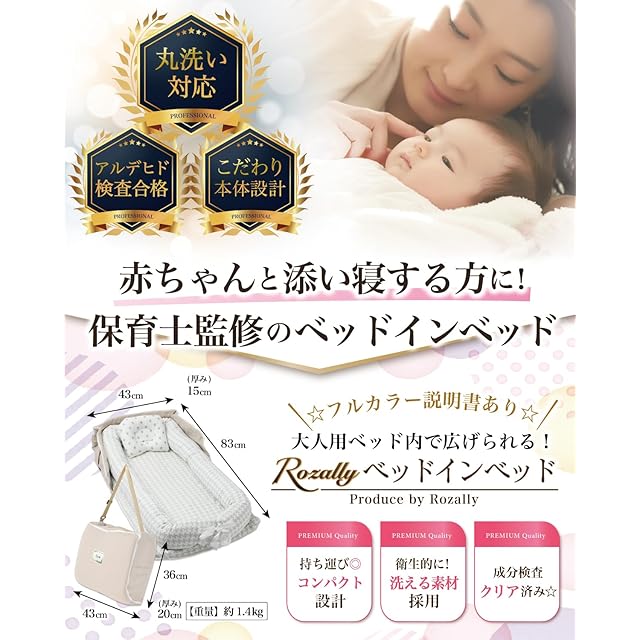 【保育士が監修】 Rozally ベッドインベッド がついに正式販売開始。 赤ちゃん と 添い寝 をする時に 寝返り防止 機能がある ベッドインベッド が欲しい…というお客様の声から生まれた 持ち運び 可能なベットインベットです。 乳幼児 がリビングなどママさんの目の届く所で寝れるように “折りたたみ コンパクト”&”軽量”の 持ち運び設計で企画させて頂きました。 企画&設計では 新生児 や ベビー の育児に詳しい【保育士】の先生からアドバイスをもらい、 折り畳み 方法 や 転落防止 など色々な使用方法を説明書として添えて企画&開発しました。衛生面にも配慮して、通気性 がよく 洗濯可能 なモデルになっています。