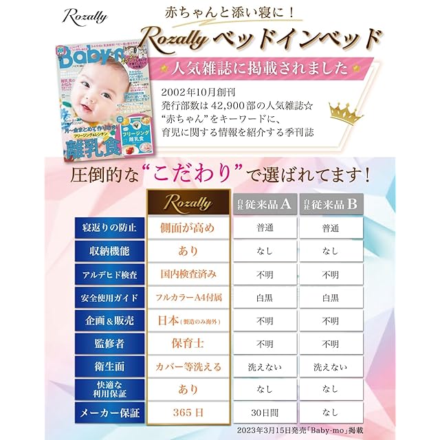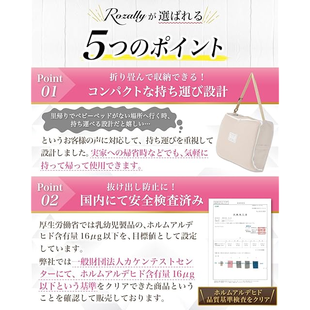 【こだわり】様々なメーカーから 赤ちゃん用 や ベビー用 のお昼寝用品として” ベッドインベッド ”が販売されていますが、Rozallyの ベッドインベッド は”こだわり”が一味違います。 乳幼児用ベッド や ベビーベッド の関連製品 などメインに取り扱っている10社以上の工場からサンプルを取り寄せ、「持ち運び×コンパクト」と「寝返り防止×転落防止」を一緒に試行錯誤して頂けた1社に絞って発注を行なっています。 製造カラーについても 男の子 女の子 のお好みに合うよう5カラーにて展開をさせて頂きました。