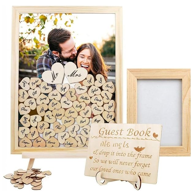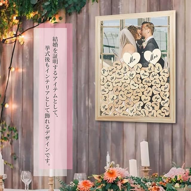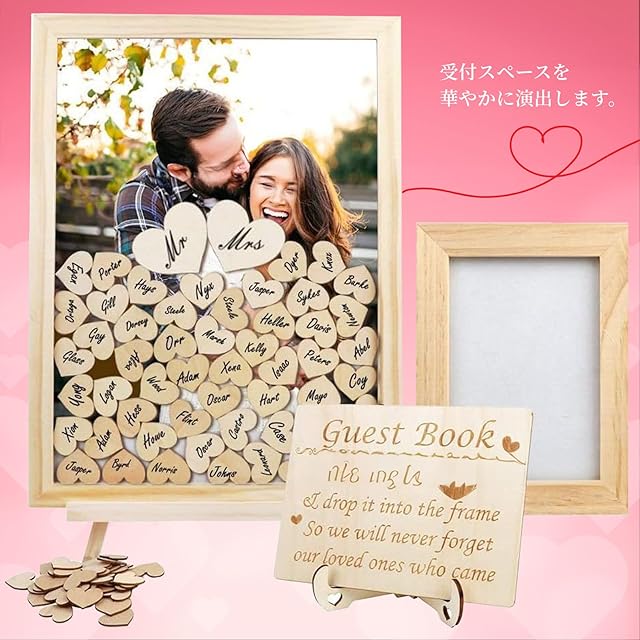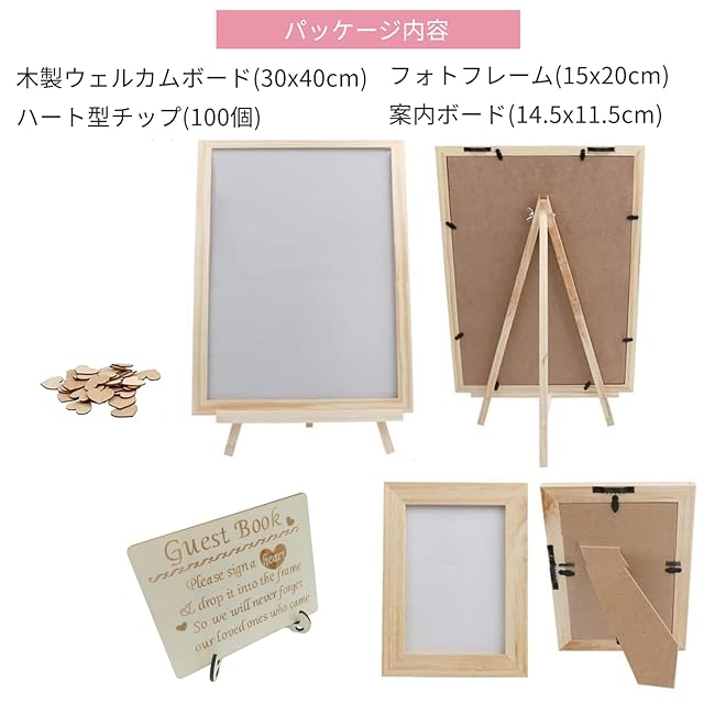 パッケージ内容:木製ウェルカムボード(30x40cm)&ハート型チップ(100個)、フォトフレーム(15x20cm)
