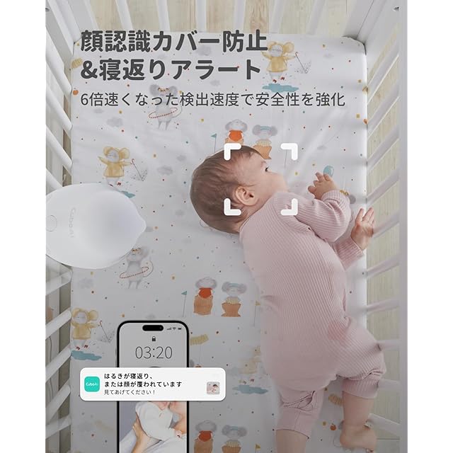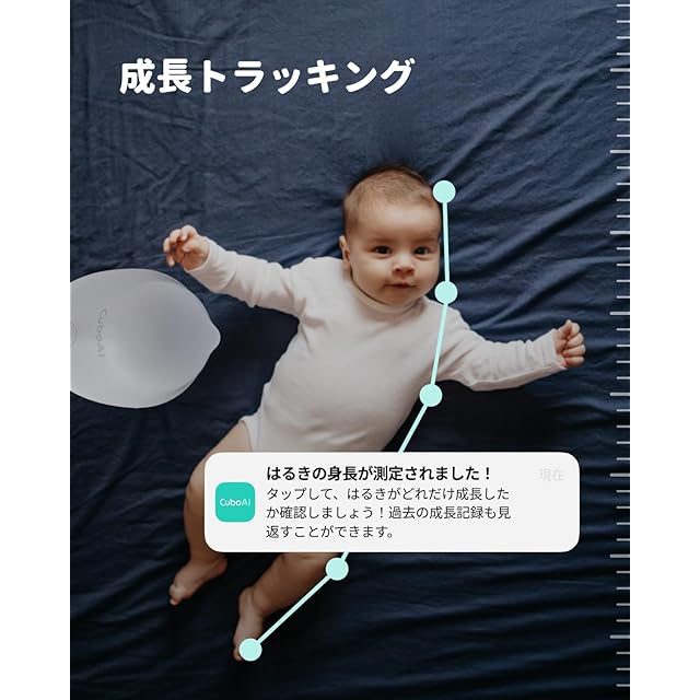 【睡眠安全アラート】改良されたAI検出技術により、顔が覆われた場合や寝返りの検出が行われ、赤ちゃんが最も必要としている時にママパパがすぐにアラートを受け取ることができます。最新のAI技術を搭載し、追加のアクセサリーなしで赤ちゃんの身長を自動で測定し、赤ちゃんの成長を追跡することができます。