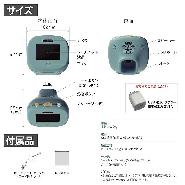 【スマホとメッセージ交換ができる】 スマホから「はろもに」に、テキストメッセージまたはボイスメッセージを送れます。「はろもに」からスマホへ、ボイスメッセージが送れます。外出先から留守番中のお子さまと「はろもに」を介して連絡を取り合うことができます。 ※録音時間は最大30秒です。 内蔵カメラ付きで、音声メッセージとともにメッセージ録音時のお子さまの表情(画像)が届きます。 ※ビデオ機能はありません。