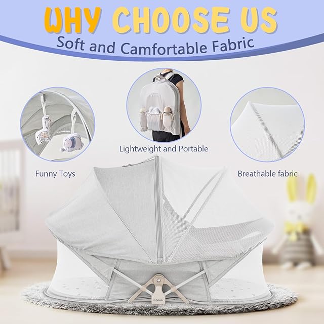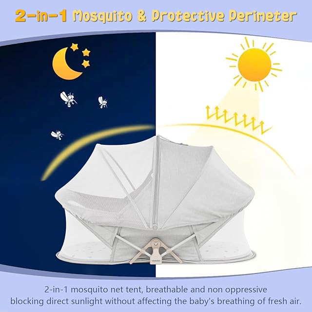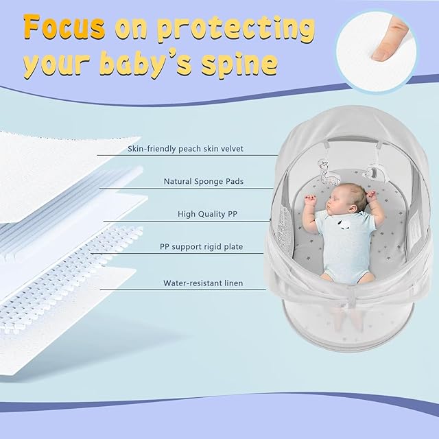 【360°赤ちゃんを保護】: 取り外し可能な2-in-1蚊帳が付属しており、屋外で使用する際、日光と蚊を効果的にブロックします。ミニベビーベッドは3層の肌に優しいマットレスがあり、最下層にはPPサポート硬質プレートがあり、赤ちゃんの背骨を十分にサポートします。