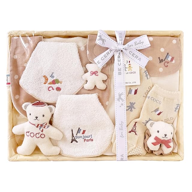 セット内容: くまモチーフ付スタイ、クマ型のマスコットガラガラ、背中の汗取りパット、クマ型リストラトル、授乳用タオルスタイ2枚、パリモチーフ総柄ソックス、竹カゴ付き、ブランドリボン付き、白色お手提げ紙袋付き、お祝いコメント付きショップカード付です。