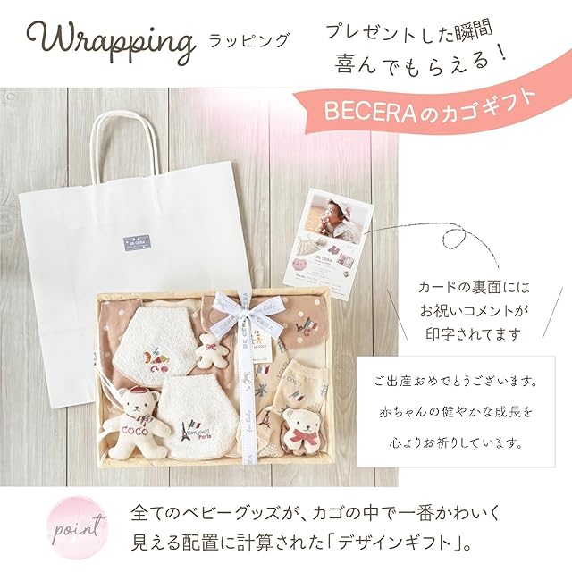 贈り物に最適: すべてのベビーグッズがカゴの中で一番かわいく見える位置に配置したデザインギフトで、ブランドリボンでラッピング、そのままギフトとしてお渡しできます。