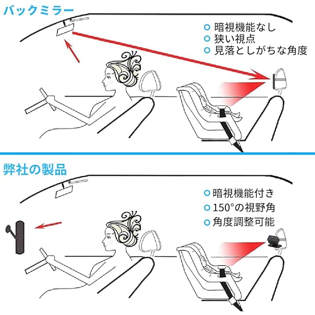 【ナイトビジョン機能】カメラは暗視機能付きで、夜間運転でも、後部座席の子供の像をはっきりと見え、赤ちゃんの睡眠を妨げるためにライトをオンにする必要はなく、不安や心配を解消するのに役立ちます。安心して運転に集中できますし、安全性もアップ!