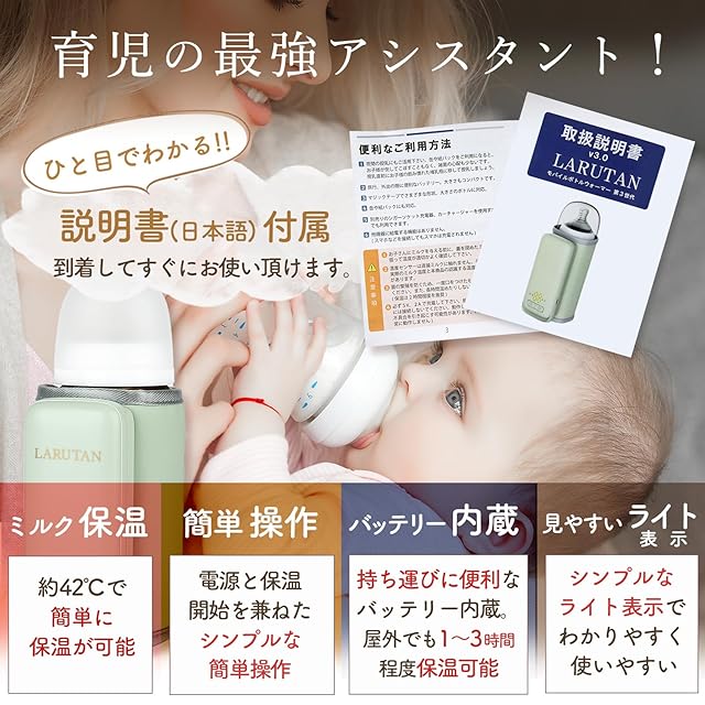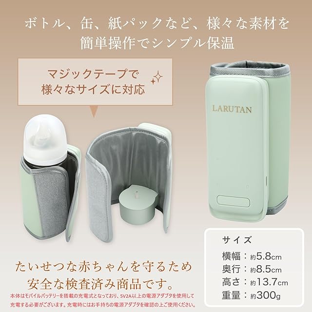 【付属品】USBケーブル / 説明書(疑問解決方法記載) / LARUTANボトルウォーマー本体 ※USB電源アダプターは付属しません(別売)。5V,2Aのアダプタが必要です。それ以外(スマートフォンなどで使用されている5V1Aのアダプタなど)のアダプタをご使用による 故障につきましては責任を負いかねます。※USB PDアダプター(スマートフォン急速充電用など)は使用不可のためご注意ください。必ず取扱説明書をお読みになってからご使用ください。また本製品は充電式のため、使用前に充電が必要です。
