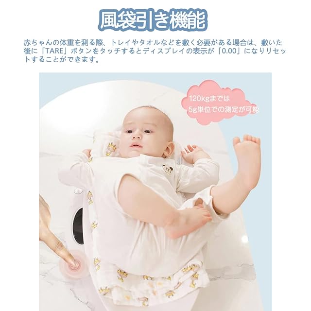 【優れた風袋機能付き】風袋機能により、赤ちゃんの体重をより正確に測定できます。 タオルなどを赤ちゃんと一緒に載せでも誤差は出ることはない。タオルをベビースケールに置き、TAREボタンを押してから、赤ちゃんを置いて測定すると、重さを差し引いて計量する風袋機能で精確的に計測することができます。