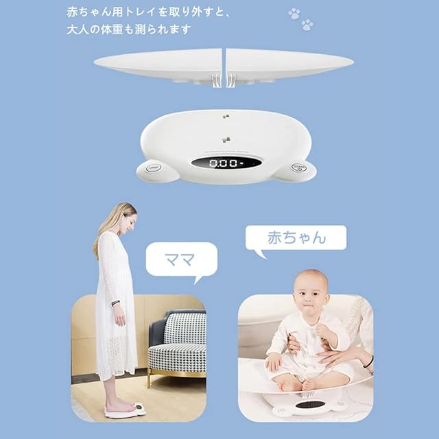 【家族みんなで一緒に使える体重計】 赤ちゃん用のトレイは取り外しができ、大人も体重測定が可能。 秋田犬や柴犬などペットの体重も計れます。本製品は120kgまで測れるので、赤ちゃんを抱っこして一緒に測定することもできます。 これ一台で家族みんなの健康管理が出来ます。