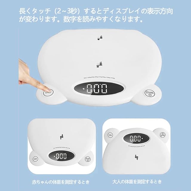 【それぞれ素晴らしい機能】1、見やすいLEDディスプレイ:はっきりと大きい数字が見やすいLEDディスプレイ。2、表示方向が変更できるので、赤ちゃんの体重測定をするとき、自分自身の体重測定をするとき、それぞれで見やすい方向に設定できます。3、自動ロック機能:計測中、3回ほど数字が動いた後、自動的に計測値がロックされます。