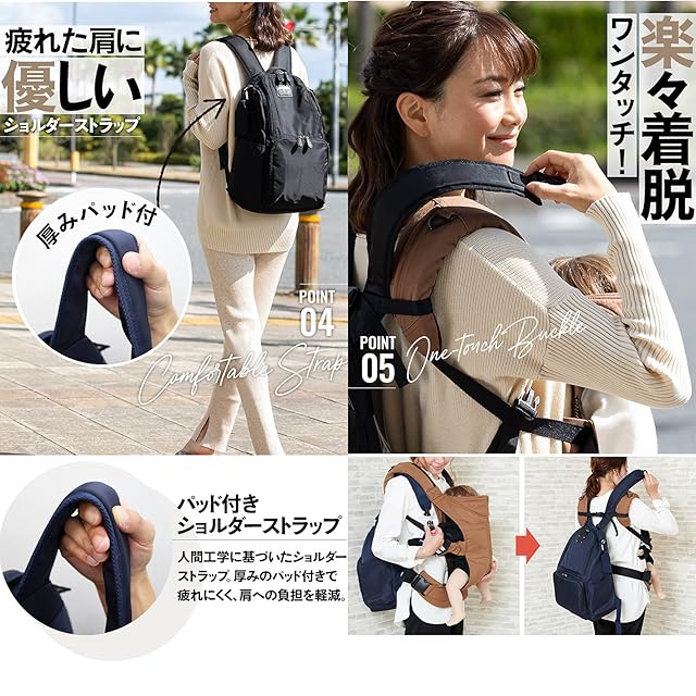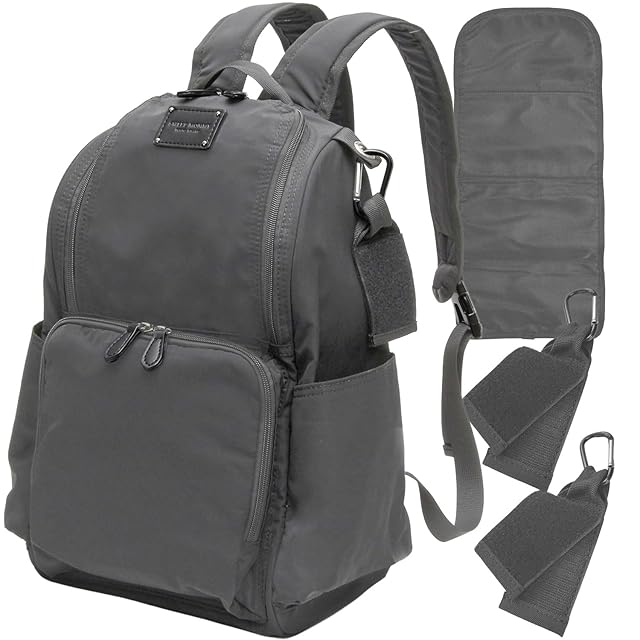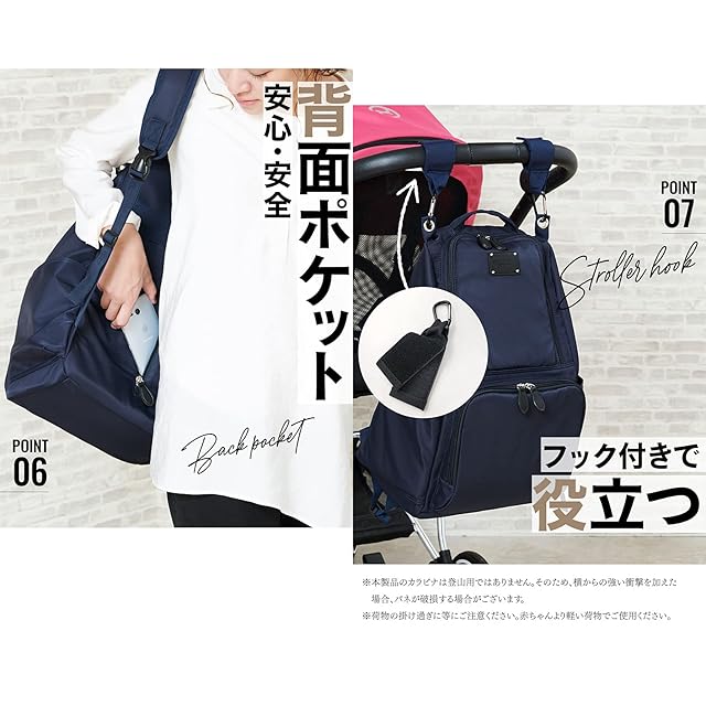 【おすすめポイントいっぱい!】①パパも兼用しやすい、スタイリッシュなデザイン!②整頓しやすい6ポケットで使い心地も抜群汚れにくい③安心の撥水加工④抱っこ紐をしたまま、バックルを外すだけでリュックがおろせる⑤中身が取り出しやすい自立型⑥背負ったまま取り外し可能な背面ファスナーは盗難防止にも⑦キャリーケースにオンできるベルトつき⑧取り外し可能なベビーカーフックつき⑨樹脂ファスナーでベビーの素肌を傷付けにくい