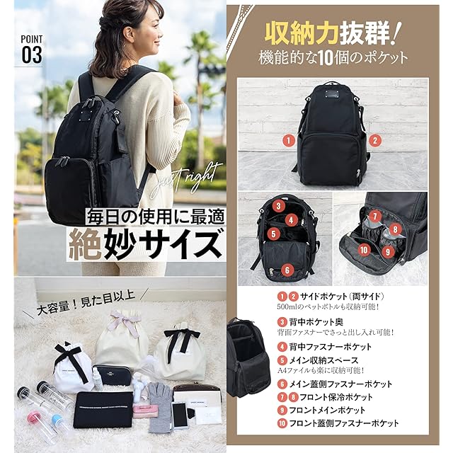 【6つのポケット】①パカッと大きく開くフロントポケット②ファスナーつきの背中ポケット③背負ったまま開ける背面ファスナーとつながっている背中ポケット奥④保温保冷シート付のボトルフォルダーポケット⑤500㎖のペットボトルも収納できるサイドポケット⑥中身がわかるメッシュポケット