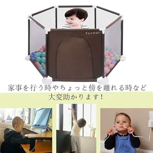「倒れにくい安全設計」:①パイプを接続するだけの簡単な構造ですが、底面がある為寄りかかっても倒れにくいしっかりとしたつくりです。つかまり立ちなどで子供がパイプをつかんでも倒れないので安心して遊ばせておくことが出来るベビー フェンス。②5面メッシュなので、外から中の様子が見られて安心のプレイヤード!③ソフトメッシュ素材でぶつかっても安心!