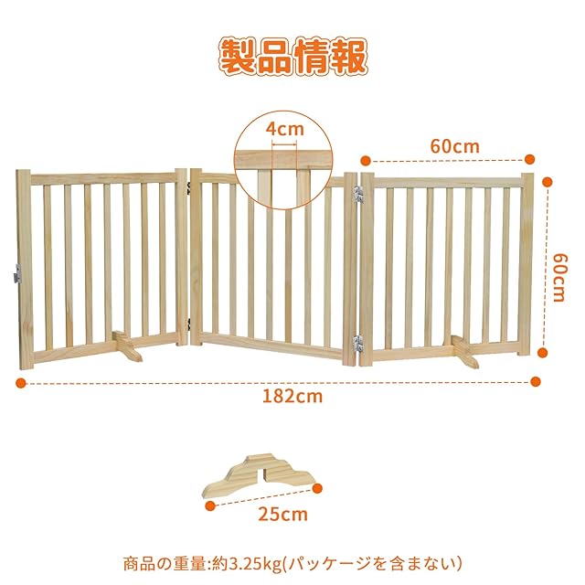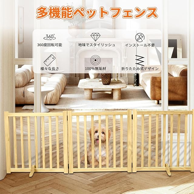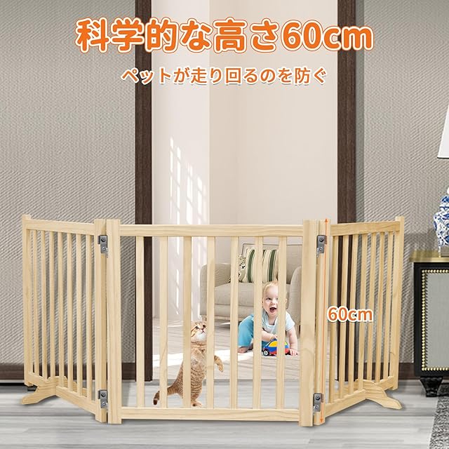 HEEOREV 木製ペットゲート ペットゲート ベビーゲート 犬用ゲート (長さ182cm 、高さ60cm) 折り畳み式ゲート 柵 犬 ゲート 安全柵 猫 ドアフェンス 室内 猫 大型犬 脱走防止 軽量 ペット保護 取り付け簡単 場所を取らない 収納しやすい 省スペース シンプルでスタイリッシュ(3つのパネル)