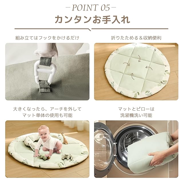 「組み立て簡単&収納便利」プレイマットはわずか1分で簡単に組み立て、分解が可能。折りたためるので収納や持ち運びにも便利です。また、拭き取りやすく、洗濯機でも洗えるため、清潔に保ちやすいです。