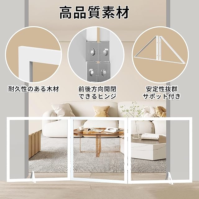 【高品質な素材】ペットゲートは、周りが高品質木材で作られ、中心にアクリルで作れております。ホワイトのカラーペットゲートで、お部屋の雰囲気に合わせて使えます。赤ちゃんやペットのいる家庭に人気があります。ペットゲートの素材は強度があり、変形しにくい、ペットの噛みつきにも耐えます。犬用フェンス清潔に保ちやすく、お手入れ便利です。ノイズを出さずに前後方向に開閉できるヒンジが付いています。