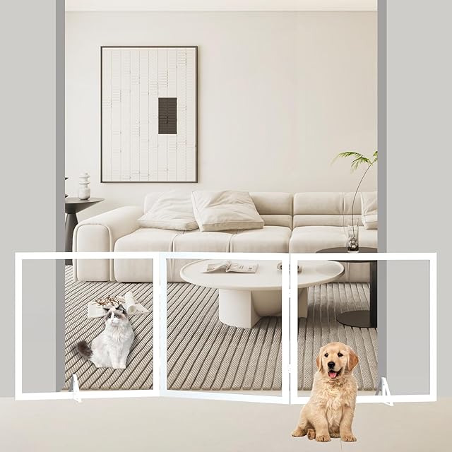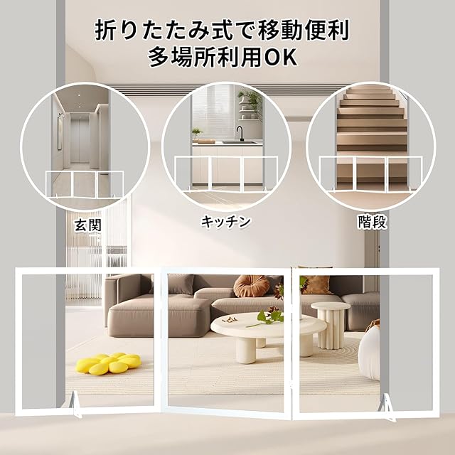 【安定感がある犬用フェンス】両側に三角形サポットが付いており、安定性が高いです。ペットの衝撃にも耐えます。ペットゲートの底部には隙間がなく、赤ちゃんやペットが抜け出したりするのを効果的に防ぎます。透明なアクリル板で、子供やペットの状況を観察することができますので、不安を解消できます。犬用フェンスは、以下のような様々な状況において、子供やペットの安全を守ることができます。ママがキッチンで料理をしているときや、ペットで留守番させているときなどです。