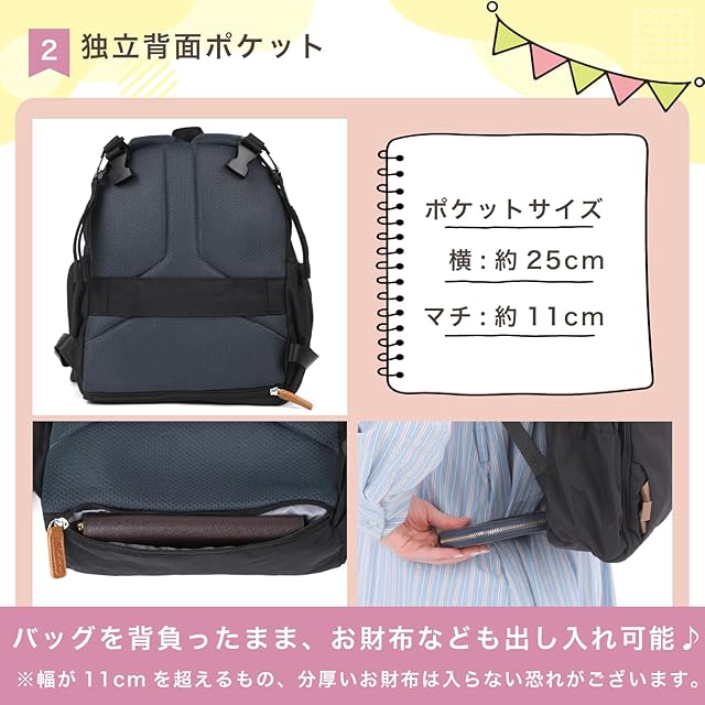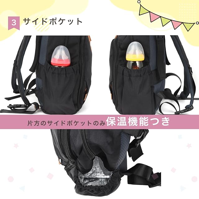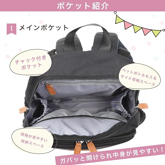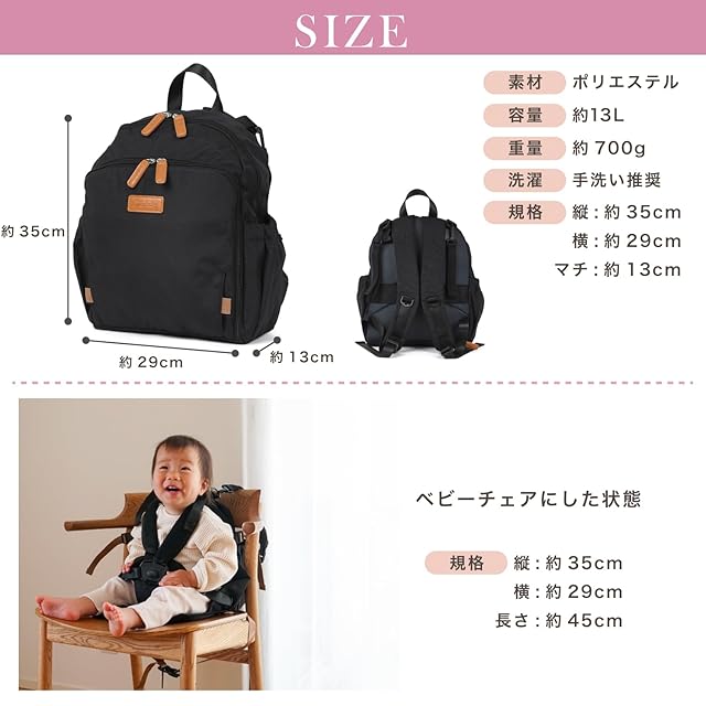 【商品詳細】カラー:オールブラック / サイズ:厚み13cm 幅29cm 高さ35cm / 重さ:約700g / 容量:13L 収納できる物:哺乳瓶、粉ミルク、水筒、離乳食、スタイ(よだれかけ)、オムツ、タオル、おしりふき、抱っこ紐、着替え、おもちゃ、財布 、携帯など。商品を開封した際に生地の臭いが気になる場合は、陰干しをしていただくことで臭いを抑えることができますので、お試しください。