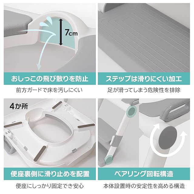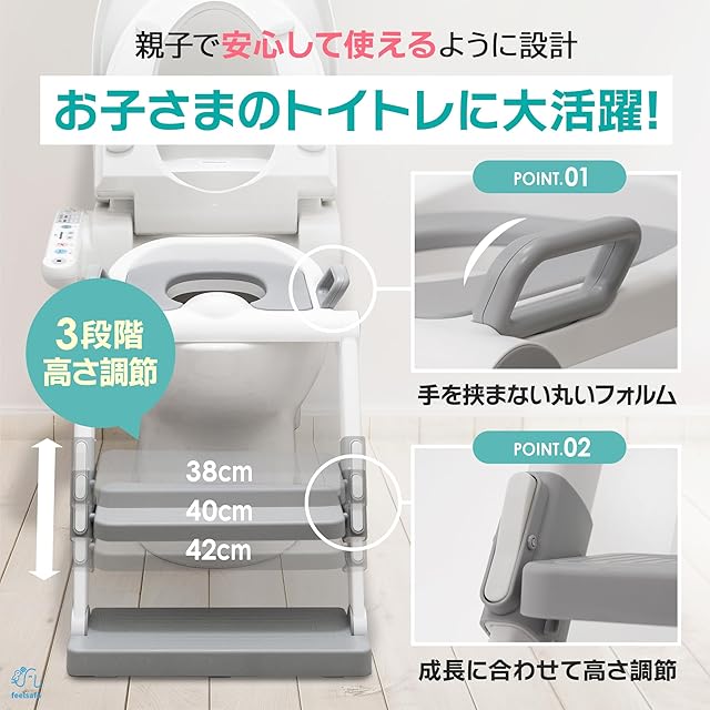 ✅【高さ調節可能×安心の滑り止め】ステップは3段階の高さ調節(38cm、40cm、42cm)ができ、身長に合わせて使いやすい位置で使用することが可能です。ステップ部分には滑りにくい加工を施しているので、お子さまが滑って転倒してしまうのを防ぎます。また、本体脚裏や便座裏面には滑り止めがついており、トイレにしっかりと固定することができます。