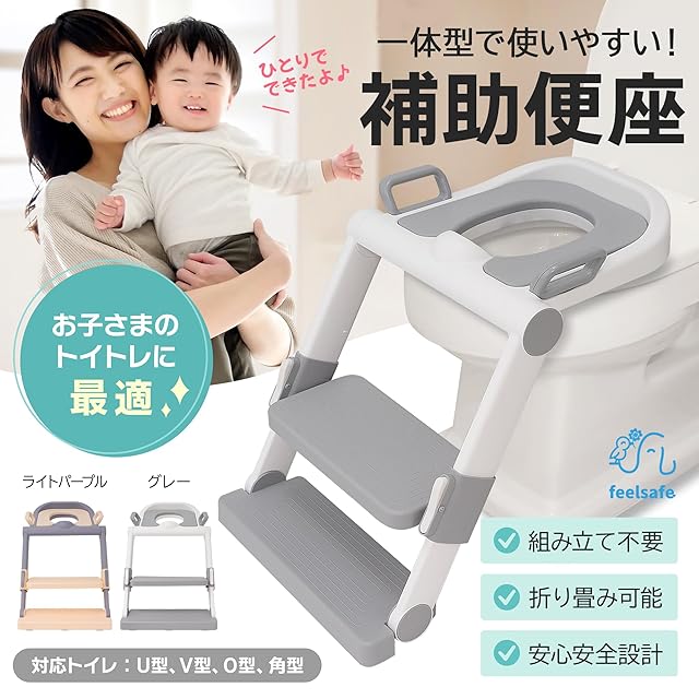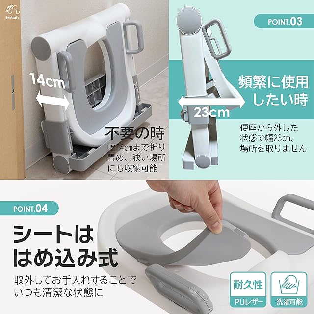 ✅【一体型×省スペース】feelsafeの補助便座は、面倒な組み立てが要らない一体型に設計。サッと開き、様式トイレの上に置くだけですぐに使うことができます。両サイドには丸みのある持ち手がついており、お子さまが手を挟んでしまう心配もなく、安心してひとりで座らせることができます。また、不要な時には幅約14cmとコンパクトに収納することができるので、収納場所にも困りません。