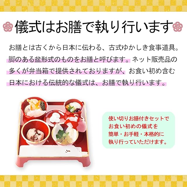 付属品 歯固め石×3 福石入れ (歯固め石保管用の小鉢)×1 柳両口の祝箸(約24㎝)×1 紅白鯛飾り×1 紅白敷き紙×1 お食い初め儀式マニュアル(鯛のアレンジレシピ付)×1 使い捨て手袋×1 お食い初め記念ポスターを作れるQRコード(インストール不要)×1