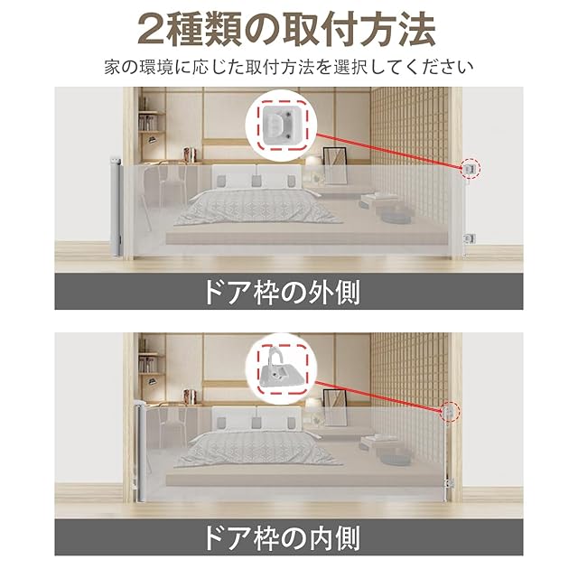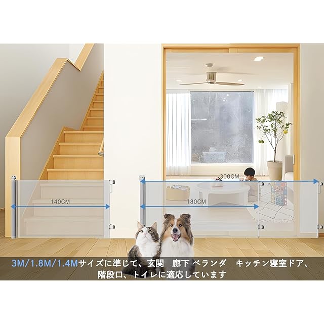 ▩巻き取り式デザインベビーゲート 色々なドア横幅兼用▩:この格納式ベビーゲートが、使用する必要がない時、収納が便利で省スペースです。リール伸縮設計により、様々なサイズのドアフレーム(幅140CMまで)に対応でき、ベビーフェンスのサイズの不適切さが使用に影響する悩みはありません。フックタイプ接続とメッシュ式ドアバーのデザインにより、片手でメッシュのドア柵を開けって使用できます。 ご家には乳幼児或いは犬猫などの小さなペットがいる場合は、このベビーズゲートがぜひお勧めの商品です。兼用ドア横幅サイズ参考:片開きタイプドア(3尺系)横幅740mm/親子ドア(4.5尺系)1190mm。
