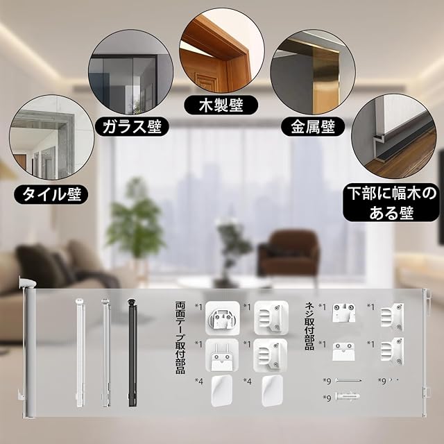 ▩ネジと両面テープ付くのベビーゲート仕様▩:この階段用ベビーゲートは、メッシュ布の幅が最長で140CM、高さ86CMで、幅180CM以内の出入り口に設置可能で、ネジ取付部品と両面テープ取付部品が付属しています。商品仕様:メッシュ布ベビーゲート本体*1、貼り付けパーツ(プラケット*2;フック*2、両面テープ*8、英語取付説明書)、ネジ付けパーツ(プラケット*2;フック*2、膨張チューブ*9、長ネジ*9、短ネジ*9、英語取付説明書)、日本語説明書*1。貼るパーツを複数購入の場合は、部品リンク【www.amazon.co.jp/dp/B0D522W5KH】ご購入してください。