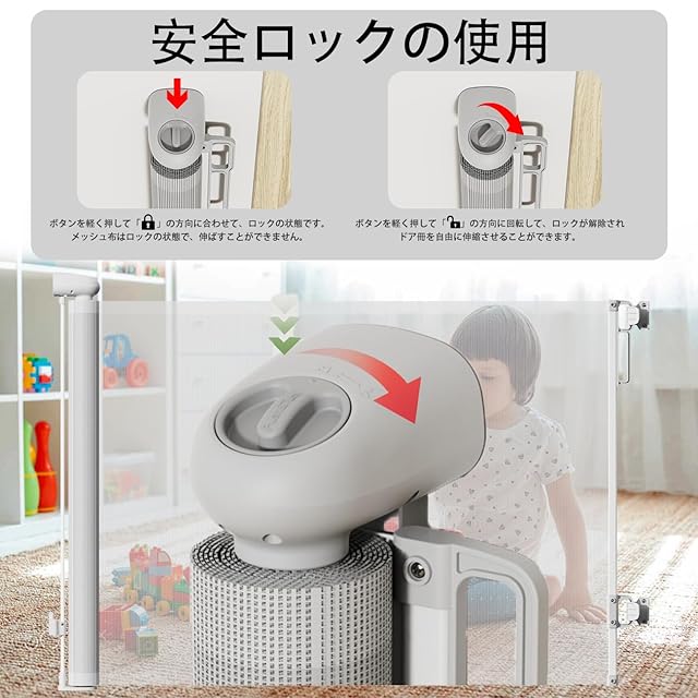 ▩安全ロック設計、不注意接触を防ぐ▩:安全ロック機能、操作が簡単で、片手で操作してドアの柵を開けることができます。ボタンを押してロックアイコンに向かって回転して、メッシュドアバーはロック状態となり伸縮できません ;アンロックのアイコンを向かって回転して、アンロック状態になって、メッシュドアバーが正常に伸張することができます。ドアバーがフックに掛けられているとき、安全ロックをロック状態にねじると、メッシュ布を移動することができません。乳幼児が不注意な触れるのを防ぐことができます。