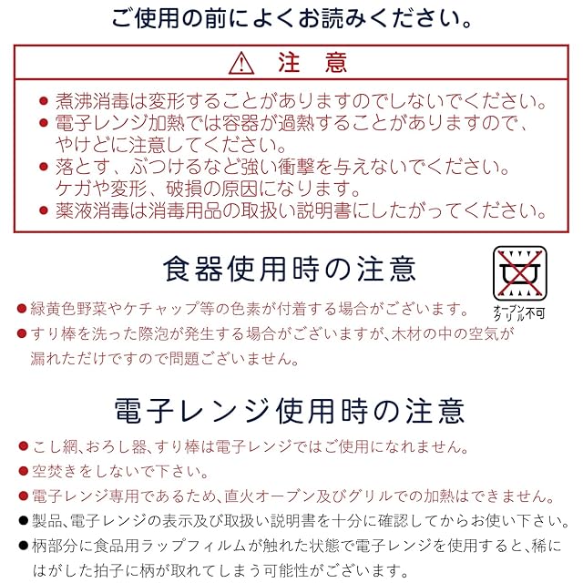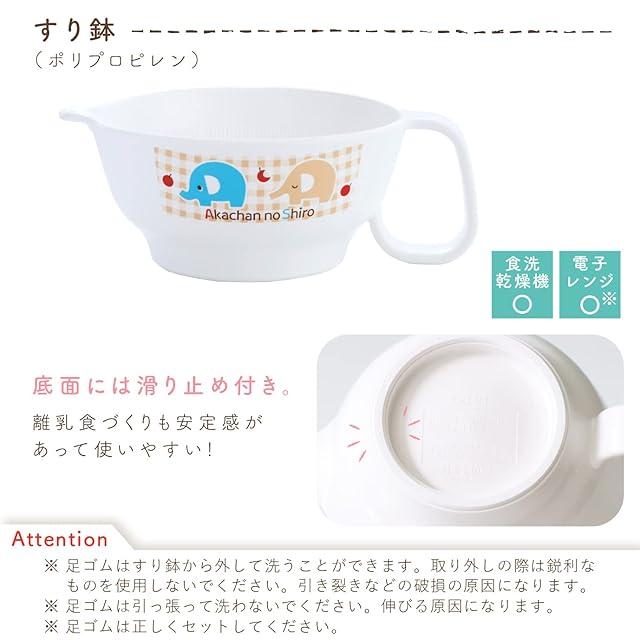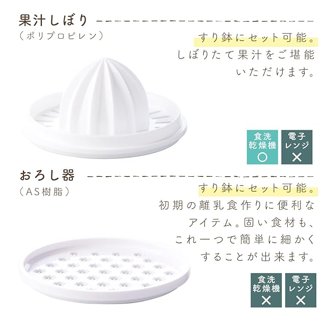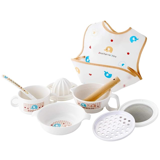 【セット内容/素材】すり鉢(ポリプロピレン)、すり棒(天然木)、こし網(ポリプロピレン・ステンレス)、 おろし器(AS樹脂)、果汁絞り(ポリプロピレン)、スープマグ(ポリプロピレン)、 ファーストプレート(ポリプロピレン)、フィーディングスプーン(ポリプロピレン)、 立体エプロン(本体:EVA樹脂)、スタイ(表:綿100% 裏:綿80%ポリエステル20% 中:ポリウレタンラミネート)
