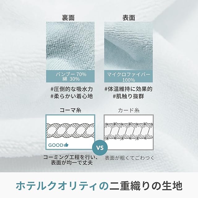 【再生素材バンブー混用】コットンの特性を活かしながら抗菌性、通気性、吸水性に優れたバンブー素材を混用し、雲のように柔らかく吸水力の高いバスローブ生地が完成しました。