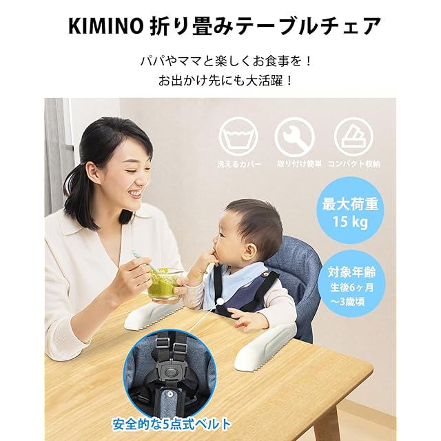 KIMINO テーブルチェア【生後6ヶ月から利用できる】ベビーチェア 折りたたみ テーブルチェア 離乳食 赤ちゃんテーブルイス 5点式安全ベルト イス 子ども用 お食事椅子 ベビー 家庭/外食/旅行用(ネイビー)