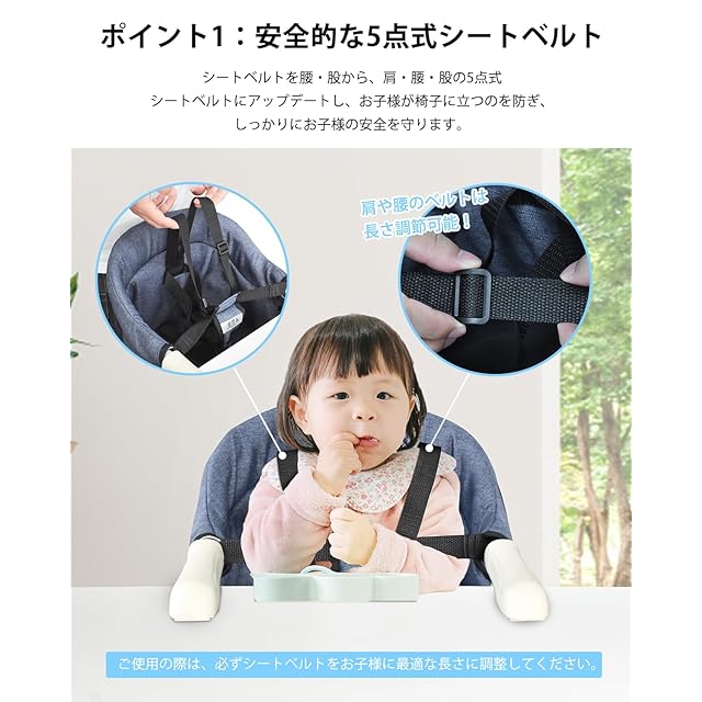 【ベビーテーブルチェア│安心できるデザイン】KIMINOベビーテーブルチェアは様々な体型の赤ちゃんに適した調節可能な5点式シートベルトが内蔵されており、赤ちゃんが椅子に立ってしまうことを防ぐことができます。アルミニウム合金製フレームプラス鋸歯状滑り止め固定ハンドルは、最大荷重15 kgまでの安定した耐久性がありあす。すべての部品がTUV認証を通じたKIMINOベビーテーブルチェアは、赤ちゃんの安全を保障でき、ご両親にも安心してご利用いただけます。