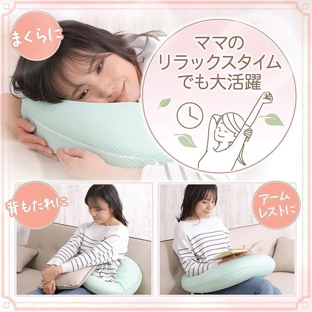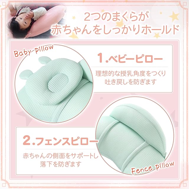 【機能性】2つのまくら(フェンスピロー、ベビーピロー)が、赤ちゃんに理想的な授乳角度とサポートを提供し、授乳時の負担を軽減します。