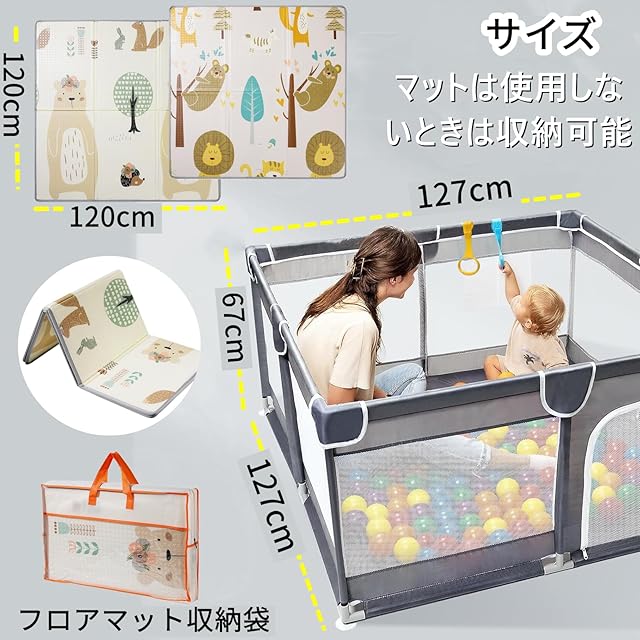 ベビーサークル プレイマット付き 120x120cm 赤ちゃん 小さめ 扉付き ベビーフェンス 折りたたみ baby playpen 子供サークル 組立簡単 洗濯可能 収納バッグ付き 日本育児 子供遊び用 (グレー+120 x 120 cmマット)