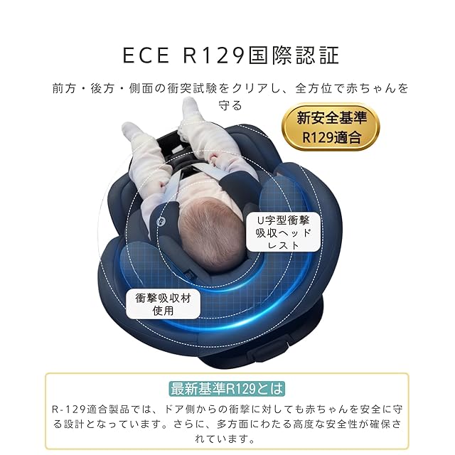 【世界基準の安全性】厳格な国際安全基準であるECE R129に適合しており、赤ちゃんやお子さまの命を守るため、衝突試験や耐久テストなど、さまざまな検査をクリアしています。さらに、体格や成長に合わせた最適なフィット感を実現し、日常のドライブでも安心してご使用いただけます。大切なお子さまのために、最高水準の安全をお届けします。