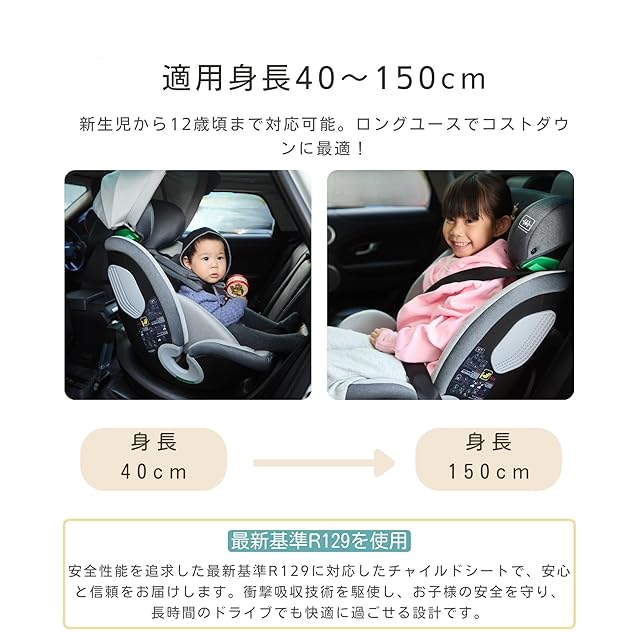 【 対応身長40cm〜150cm】 新生児から大きなお子さままで長くお使いいただけます。生まれたばかりの赤ちゃんの柔らかい体を優しく包み込み、成長に合わせてシートやベルトの調整も簡単に行えるため、いつでも安心・快適な乗り心地を提供します。