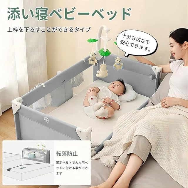 【上下2層ベッド・揺りかごモード】幼児が親の隣で眠るのに最適なベッドサイドベッド、付属の固定ベルトを使用して、大人ベッドにしっかり繋ぐことができます。下段もプレイヤードとしてご利用をいただけます。スイングバー付きで揺りかごへも変形可能、1台で3役が実現できる。(上段ベッド適用年齢:新生児~7ヶ月向け、下段ベッド適用年齢:7ヶ月~3才向けです。)