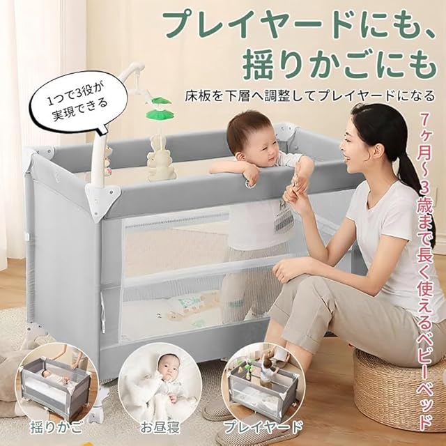 Yilucess プレイヤード 折りたたみ ベビーベッド ベビー 3in1 添い寝ベッド 長さ110cm*幅65cm*高さ78cm 揺りかご 新生児 0才~3才 ベッドサイドベッド 安心 ベビーサークル 軽量 出産祝い プレゼント 蚊帳・キャスター・固定ベルト・キャリーバッグ付 お昼寝マット 持ち運びやすい グレー