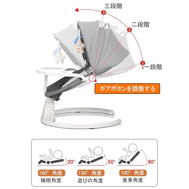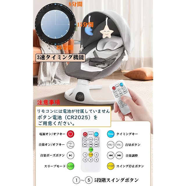 3つのタイミング設定ベビースイング:時間とエネルギーを節約するために、3段階のタイミング機能を設計しました。ボタン1つで時間を8分、15分、または30分に設定できるので便利です。赤ちゃんがより穏やかになるだけでなく、両親もより心配を感じません。