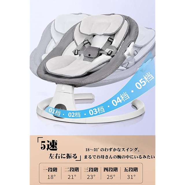 ベビースイングの5つの振幅:Brotish電動ベビースイングは、5つの異なるスイング振幅で仕上げられています。新生児の安全をよりよく保護するために、各振幅間のスイングレベルは非常に緩やかな差になるように設計されています。設定を調整して、赤ちゃんが好きなスイング範囲と頻度を見つけることができます。